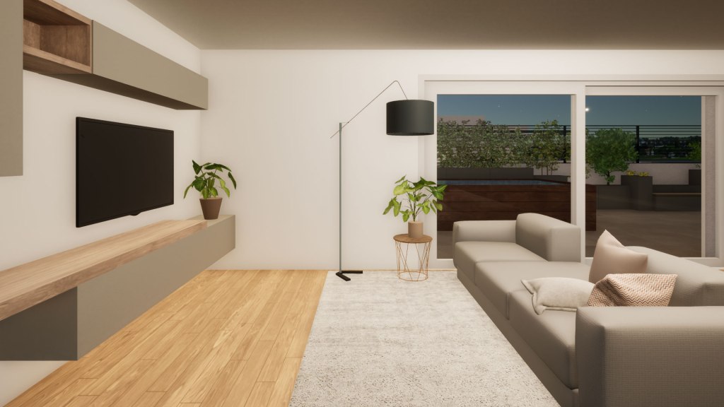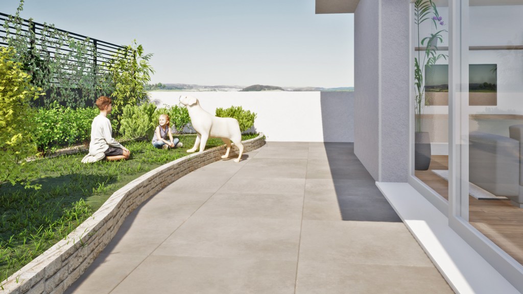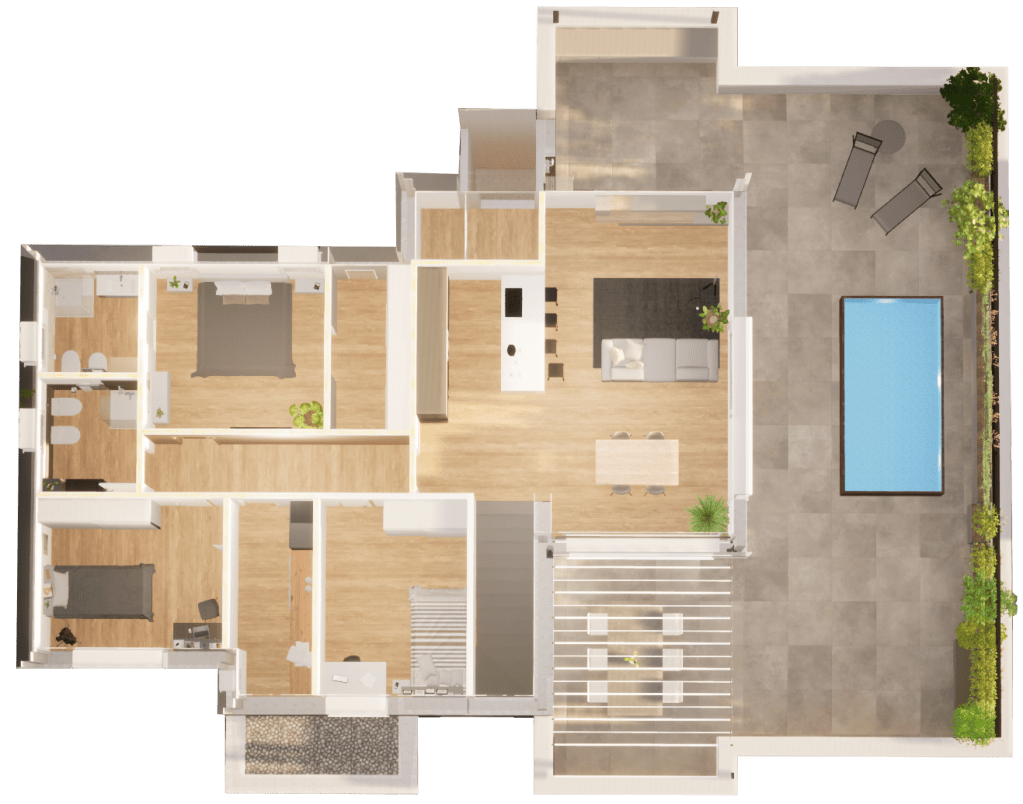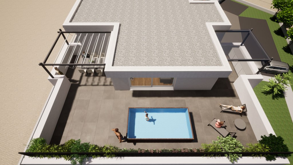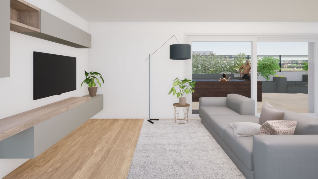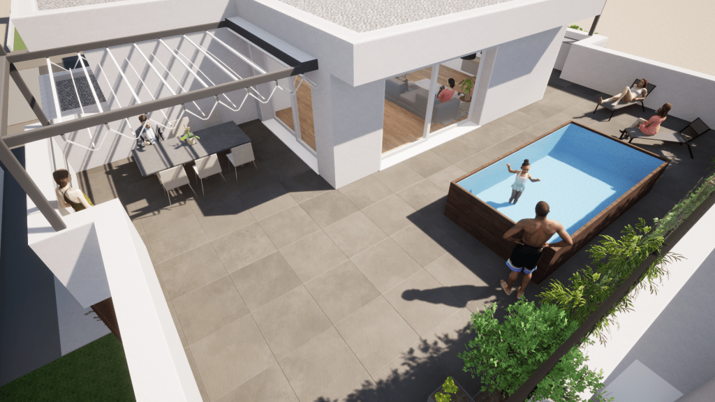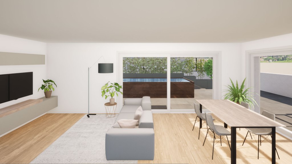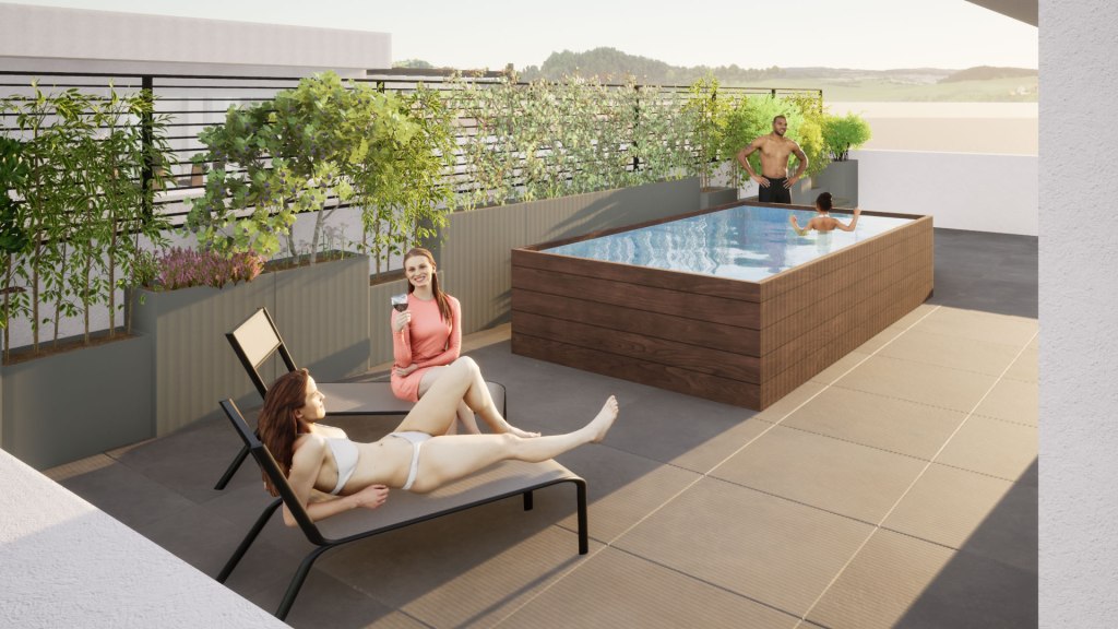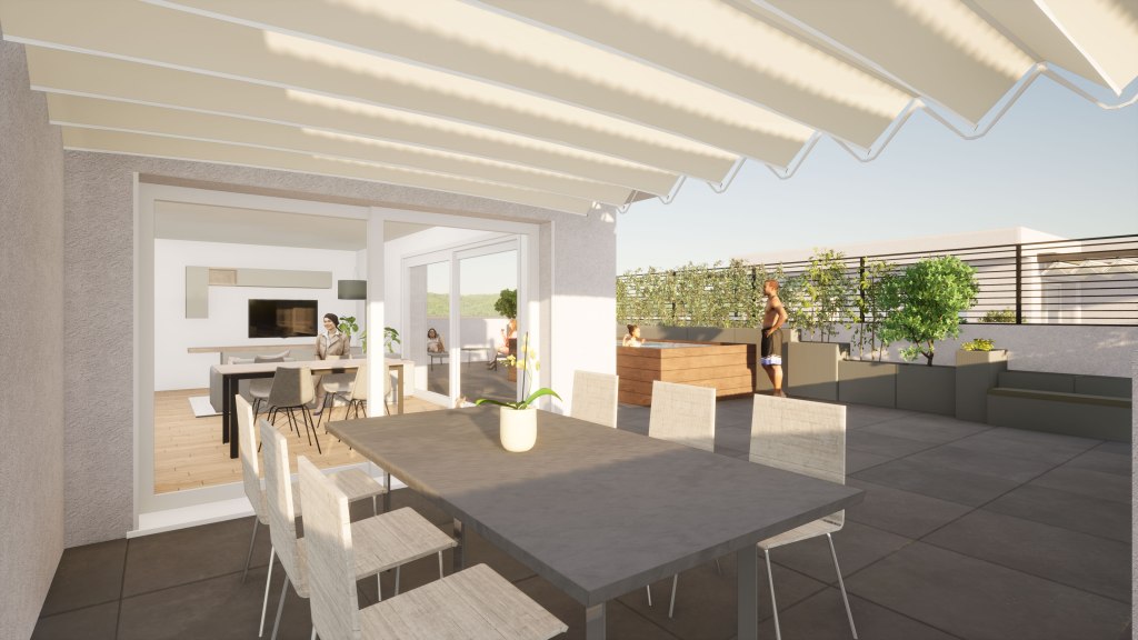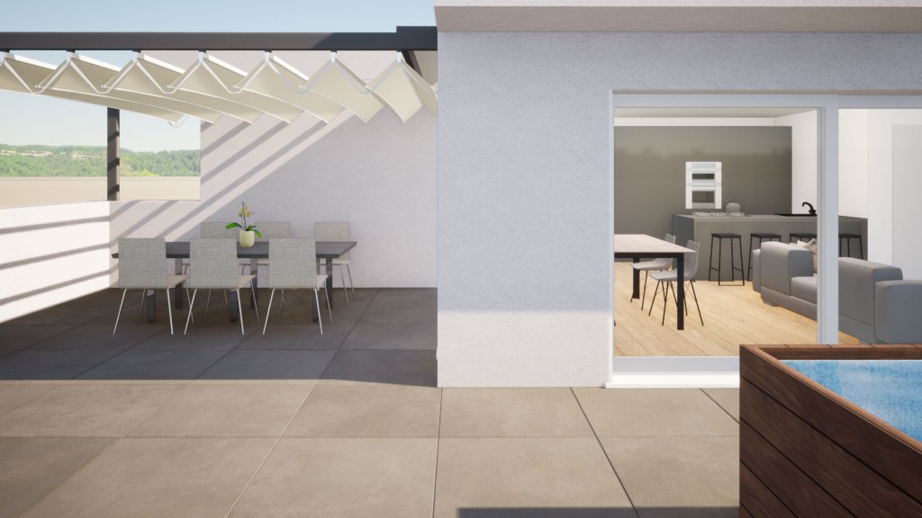 La terrazza è strutturalmente concepita per sostenere il peso di una piscina, eventualmente dotata di idromassaggio e nuoto controcorrente o, in alternativa alla piscina, si può realizzare un vero e proprio giardino, potendo sostenere fino a 15 cm di terra, opzione ideale per gli amanti del verde e della natura. Lo spazio esterno può essere parzialmente coperto anche con pergole bioclimatiche, per organizzare pranzi e cene con le persone care, senza troppi limiti sul numero di invitati.